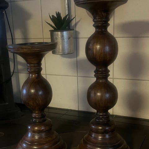 Myydään kaunis kullattu kynttilänjalkapari, jossa roikkuu koristeelliset lasiprismat.