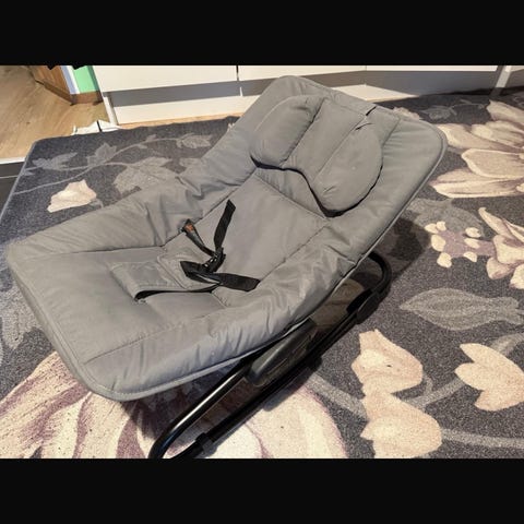 Babybjörn sitteri/bouncer harmaalla kankaalla. Kankaan voi kääntää (toisella puolella ei ole haarakappaletta). Istuin on helposti säädettävissä kolmeen eri asentoon vauvan koon mukaan.
