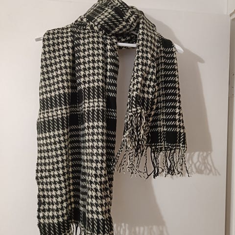 5. Valkoinen, pehmoinen sekoitelanka, kudottu 2 oikein, 2 nurin, koko pituus 160 cm + hapsut, leveys 16 cm.