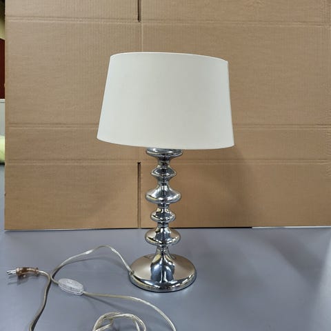 Pöytälamppu, jossa puiset jalat ja musta varjostin. Varjostin on omaan silmään vähän vääntynyt, mutta sen saa varmasti takaisin ympyräksi!