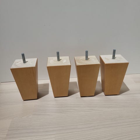 Neljä kappaletta FinSoffat puujalkoja. Korkeus 10 cm, leveys 5,5 cm. Hinta 4 kpl 12 eur.