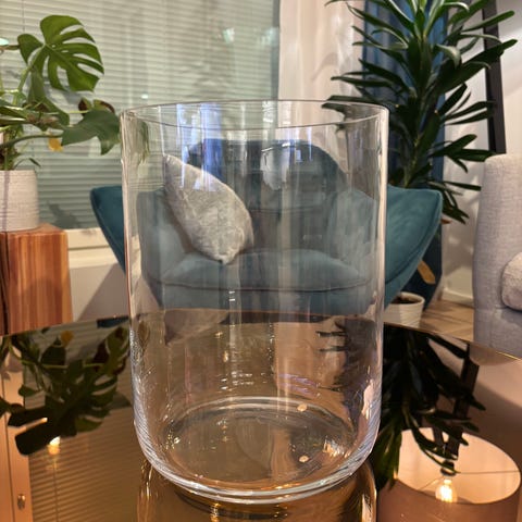Ruskea-beige värinen.Korkeus 30 cm, pohjan halkaisija 14 cm.