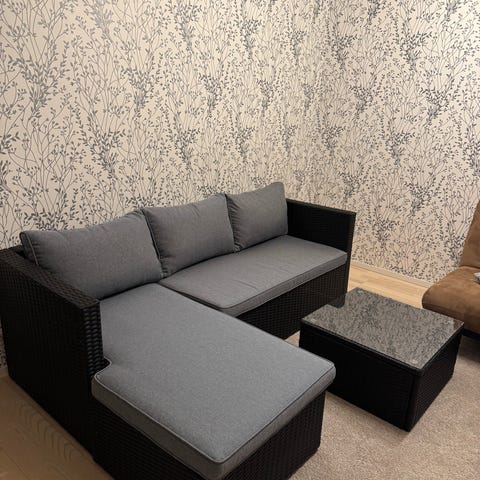 Kuvien mukainen sohvaryhmä kaupan. 2 rahi tyylistä istuinta, 2 normaali tuolia ja pöytä lasikannella. Pöydän kokoa en osaa nyt sanoa kun mittanauhaa ei löytynyt mistään.