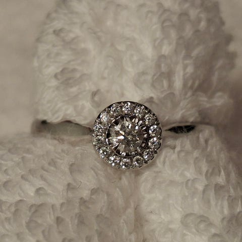 Timanttisormus, jonka päämateriaalina on kulta.. Valkokulta 585 (14k) 3.33 g koko 16 ehkä, mitattuna 1.6cm kaupassa hinta 1600e