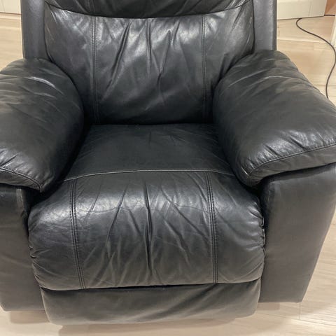 Hyväkuntoinen nahkainen nojatuoli. Takaosa kangasta, puiset jalat ja käsinojat.