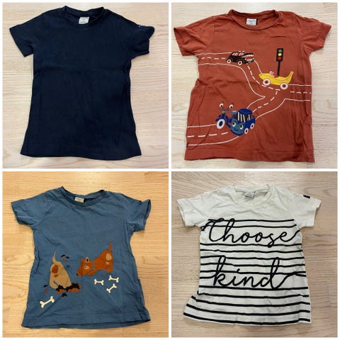 Vaaleanpunaisessa ja violetissa kunto hyvä. Uutena ostettu ja yhdellä lapsella käytetty. Pientä pesuhaitua ja hieman haalistuneet alkuperäisestä. Ehjät ja tahrattomat. Violetin paidan painokuva ei täysin ehjä (kuvat 8 ja 9).