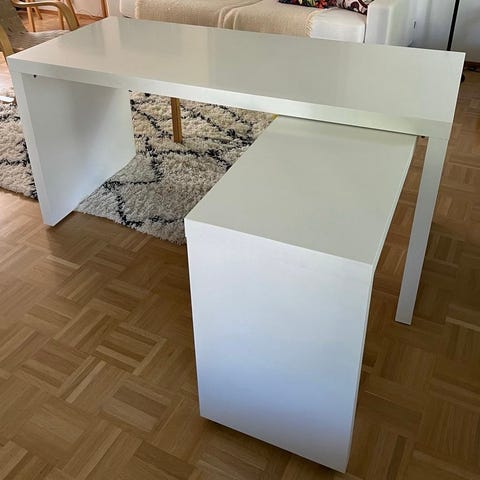 Hyväkuntoinen IKEA Malm työpöytä. Toiseen päätyyn on porattu reiät kulmarautoja ja pöytäkonetta varten. Yhdestä kulmasta lähtenyt pieni palanen. Etureunassa pieni vekki. Nämä kuvissa. Pöytätaso hyvässä kunnossa.