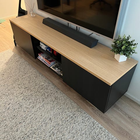 Ylimääräiseksi jäänyt TV-taso, kevyt mutta tukeva. Lisähyllyjä, vetolaatikoita, ovia tms saa Ikeasta jos haluaa muuttaa ulkonäköä. Päällä kätevä ja siisti läpivienti johdoille.
