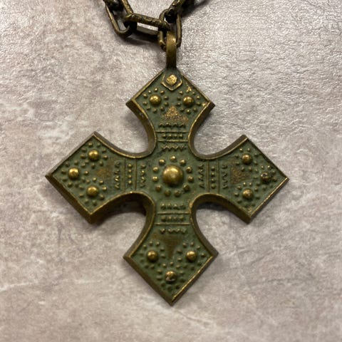 Käytössä ollut pronssinen Kalevalan Syvärinjoen risti -kaulakoru. Ketjun pituus n. 70 cm. Rasiaa ei ole. Pakettiautomaattilähetys Manner-Suomeen 6 euroa, josta saa lähetyksen seurantanumeron. Nouto Kuopiosta keskustasta.