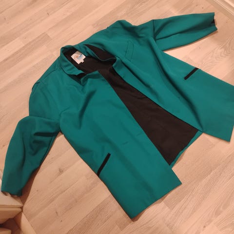 Pientä kulumaa hihansuissa sekä yksi pieni reikä lähellä kylkisaumaa.