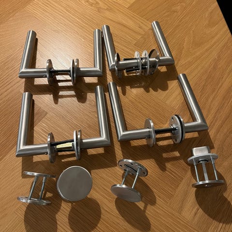Väliovenpainikesarja, joka sisältää kaksi harmaata metallista kahvat, kaksi avainkilpeä ja asennustarvikkeet.