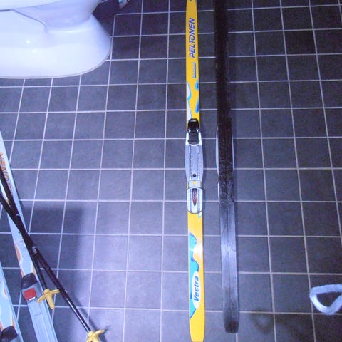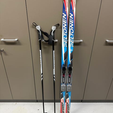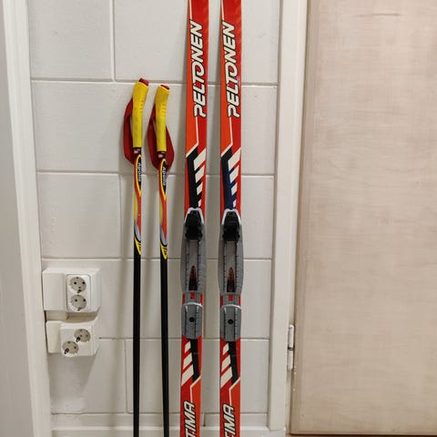 Peltosen sukset 150 cm. monot 35 ja sauvat 110 cm(?)