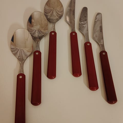 Erittäin siistissä kunnossa olevat Memory aterimet. Mukana muutama käyttämätön. 6 kpl lusikkaa, haarukkaa ja veisti, 4 kpl kahvilusikoita, 1 kpl isompi lusikka ja kakkulapio. Haarukka 186mm, veitsi 203mm, lusikka 187mm, isompi lusikka 197mm, kahvilusikan 137mm, kakkulapio 255mm. Myydään mielellään kaikki kerralla 300€ sisältäen postikulut.