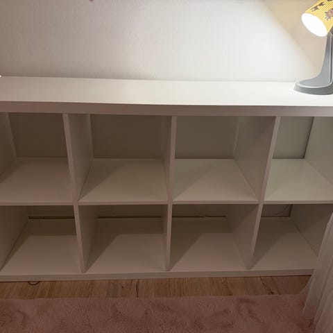 Myydään valkoinen kallax hylly, jonka mukana tulee kuvassa näkyvät 4 bränas rottinkikoria ja upotettu laatikosto.