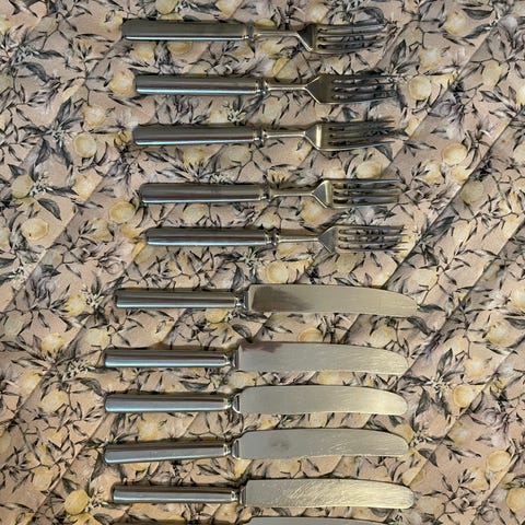 Haarukat 12kpl, Veitset 12kpl, ruokalusikat 12kpl ja kahvilusikat 12kpl.