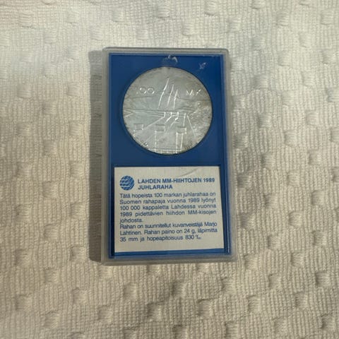 Kuusi kappaletta hopeisia juhlarahoja. Saa tarjota.