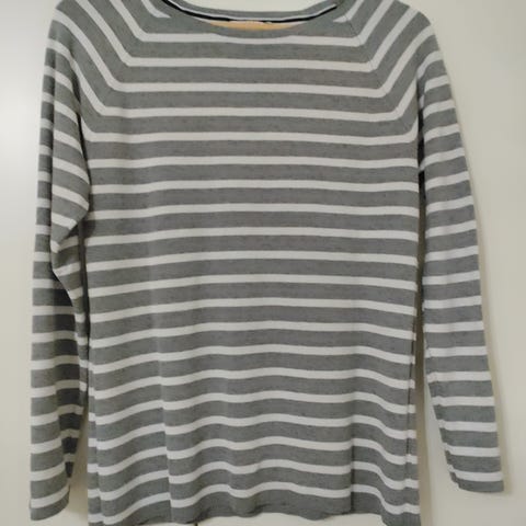 Neule ohutta neulosta. Puuvillaa 80%, polyamidia 17%, elastaania 3%. Musta väri vähän kulunut kaula-aukosta. Pituus olalta mitattuna 62 cm, kai-kai 44 cm.