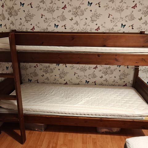 Hyväkuntoinen lasten kerrossänky ja sängyn alle sopiva säilytyslaatikko. Ulkomitat: pituus 174 cm, leveys 77, korkeus 140 cm (70 cm x2). Voidaan käyttää myös erillisinä sänkyinä. Vähäisiä käytön jälkiä.