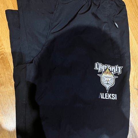 Hyvät tuulihousut koko S.Sivuissa vetoketjulliset taskut ja lahkeissa vetoketjut.