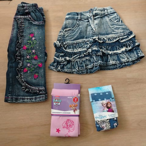 Esim. Newbie toppi/tunika, h&m topit, shortsit ja mekko, bogi shortsit ja legginsit, Lindex farkkushortsit, kaksi kesään sopivaa pyjamaa / oloasua (molemmat supersöpöjö, toisessa yksisarvinen ja toisessa kukkia).