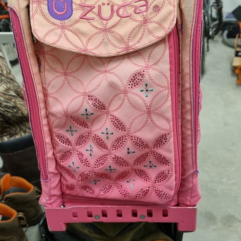 Siistissä kunnossa oleva vedettävä taitoluistelulaukku.
