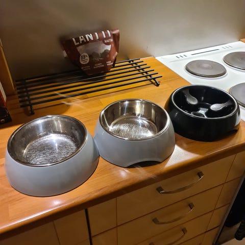 Lyttykuonoisille roduille suunniteltu ruokakuppi. En huomannut tätä ennen ostoa, joten oli huono parrakkaalle russelille.