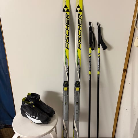 Hyväkuntoinen Lasten suksipaketti. Sukset 150cm, Fisher sprint crown. Sauvat 110cm, Tecnopro xc active alu jr. NOUTO.