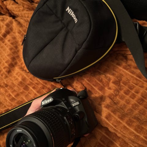 Nikon D3100 järjestelmäkamera, mukana 18-55mm objektiivi.