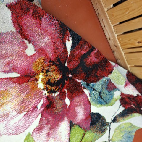 Sotka matto, jossa on värikkäitä läiskiä vaalealla pohjalla. Maton materiaali ja koko eivät ole tiedossa.