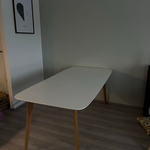 Myydään valkoinen ruokapöytä. Pöytä on melkein käyttämätön, mutta reunaan tullut pieni nirhama kuljetuksessa.