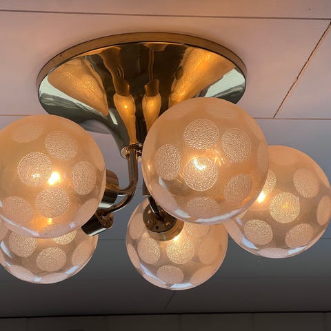 Tyylikäs Hyval vintage kattovalaisin 70-luvulta. Messinkirunko ja kaksiväriset lasikuvut. Yksi varakupu mukaan. Suht virheetön kunto.