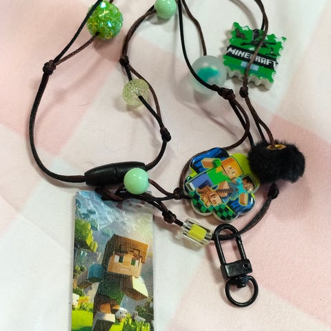 Erilaisia muotohelmiä, riipus ja pitsinauha. Tyttömäinen kokonaisuus.