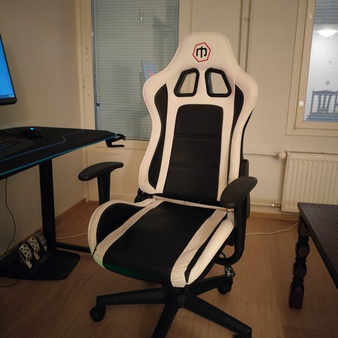 Siisti vaaleanpunainen/valkoinen pelituoli. Mukava istua pidempiäkin aikoja. Tyynyt saa tottakai remmeillä kiinni tai irti.