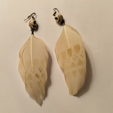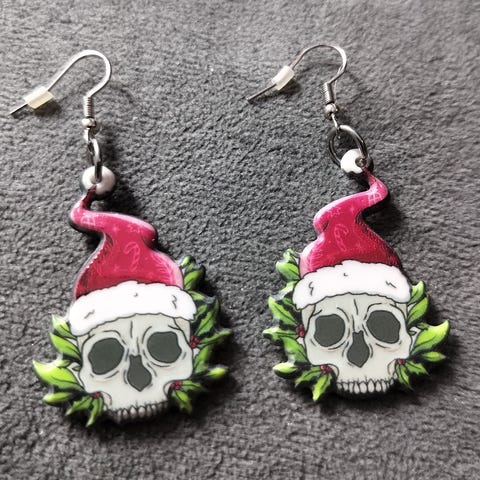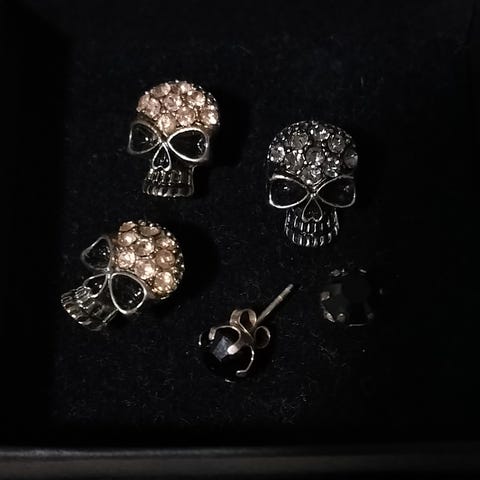 Myydään pääkallo -korvakorut. Näiden materiaali ei ole tiedossani. Nämä ovat kuluneet aika rouhean näköisiksi niin, että alta paistaa kai kuparointi. Väri on siis eläväinen. Kunto kohtalainen. Ja näistä saa myös hauskat koristeet laukkuun tai avaimenperäksä tms., jos ei halua käyttää tuntematonta metallia ihoa vasten.