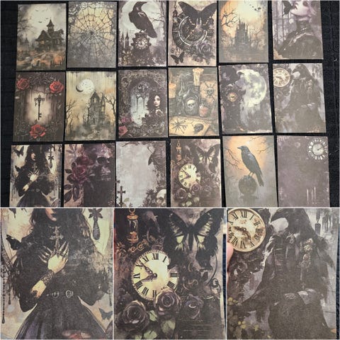 18 kpl uusia vintage henkisiä mattapintaisia papereita erilaisilla synkillä gootti aiheisilla kuvioilla skräppäykseen askarteluun korttien tekoon tai vaikkapa kehyksiin ja tauluiksi sisustukseen!