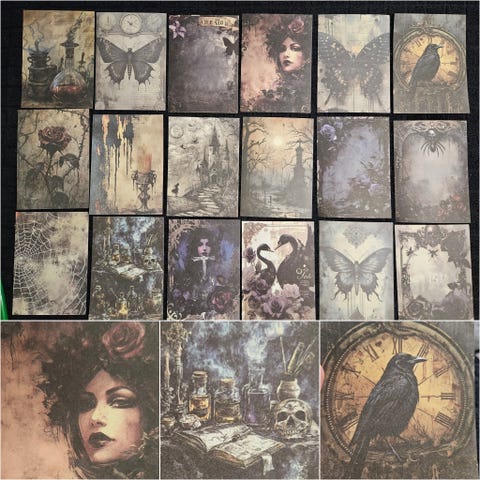 18 kpl uusia vintage henkisiä mattapintaisia papereita erilaisilla synkillä gootti aiheisilla kuvioilla skräppäykseen askarteluun korttien tekoon tai vaikkapa kehyksiin ja tauluiksi sisustukseen!