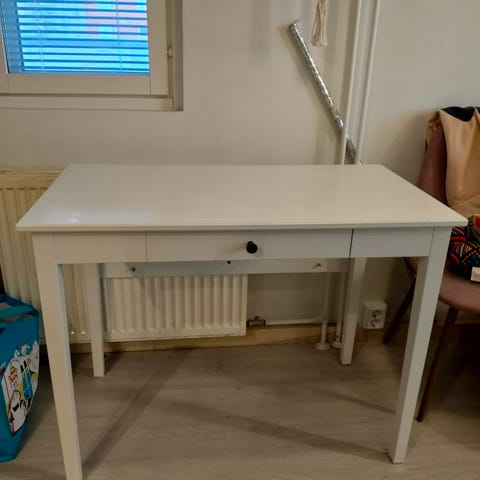 Alle vuosi sitten ostettu Ikean seinään kiinnitettävä Norberg klaffipöytä. Pöytälevyssä kestävä melamiinipinnoite, joka on helppo pitää puhtaana.
