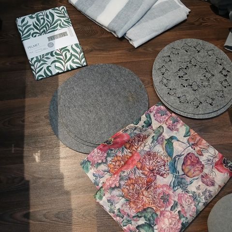 Kuvan tekstiilisetti kaupan. Settiin sisältyy kolme koristetyynynpäällistä, kaksi liinaa ja huopatabletti. Sinisen kaitaliinan pituus 128cm. Alimmaisen tyynynpäällisen takapuolen kiinnitys rikki. Kaikki yht. 5e tarjoa, jos haluat ostaa erikseen. Nouto Haminasta tai koksilta ennen/jälkeen työvuoron. Myös postitus onnistuu. Katso myös muut myynti-ilmoitukseni.