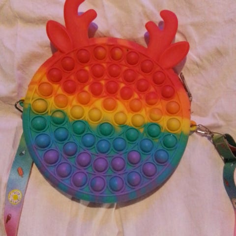 Vetoketjullinen pieni olkalaukku pormeranianin kuvalla ja tekstillä. Sanka noin 128cm. Laukun ulkomitat edestä noin 17x17cm.