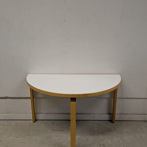 Puoli kaari pöytä, joka sopii hyvin olla vaikka työpöytänä. Mitat ovat pituus 166cm, leveys 85cm, korkeus 72cm ja syvyys 97cm