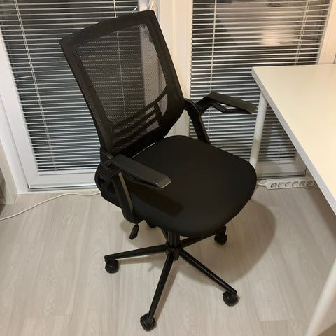 Tuoli on hyvässä kunnossa, mutta siinä voi olla pieniä käytön jälkiä. Kangas on ehjä ja jalusta on tukeva. Pyörät liikkuvat sujuvasti.