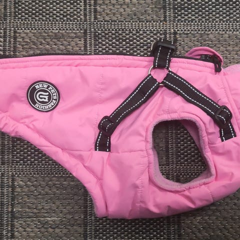 Punainen talvitakki, jossa itsessään kiinni valjaat. Pienelle (tai toy) koiralle. Koko M, eli selän pituus 25cm, rintakehän ympärys (ali) noin 45cm ja kaulan ympärys noin 30cm.