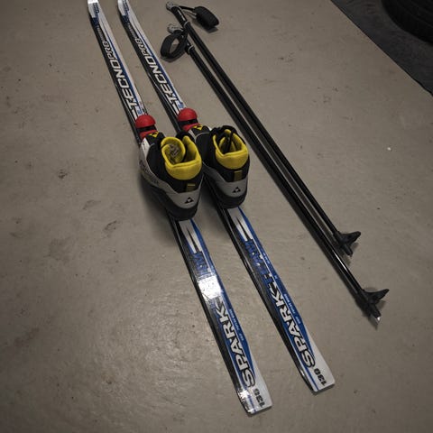 Lasten suksipaketti monoineen. Sukset 150cm. Sauvat 120cm. Monot koko 37.side NNN.