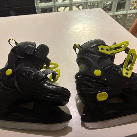 Lasten luistimet, käytön jälkeä ja kolhua on mutta ei vaikuta käyttöön. Sisäkenkä on irrotettavissa, lapsen jalan voi laittaa ensin siihen ja sitten laittaa luistimien sisään. Yksi kiristysremmi. Koko 24-25, sisäkenkä mitattaessa 15,5-16cm.