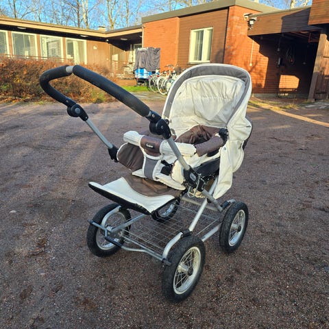 Emmaljunga viking lastenvaunut valkoisella vaunukopalla ja ruskealla nahkakahvalla. säädettävä työntöaisa. Helppo laittaa kasaan ja irrottaa koppa esim kuljetuksen ajaksi. Nahkakahvassa näkyy kulumaa kuten näissä yleensä nopeasti tapahtuu. Mielestäni vaunukopassa on materiaalina valkoinen keinonahka. Kätevä kun ei heti kastu talvella kuten kangas.