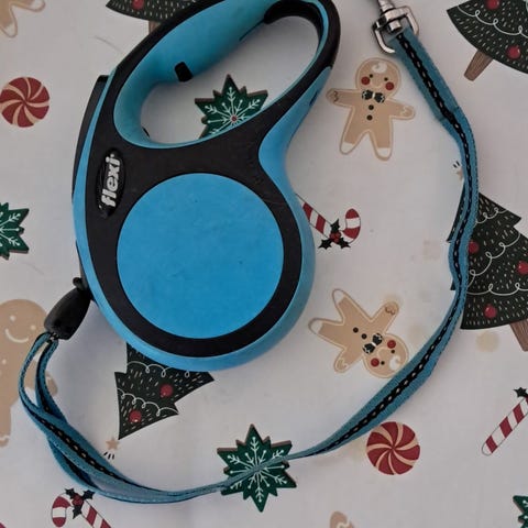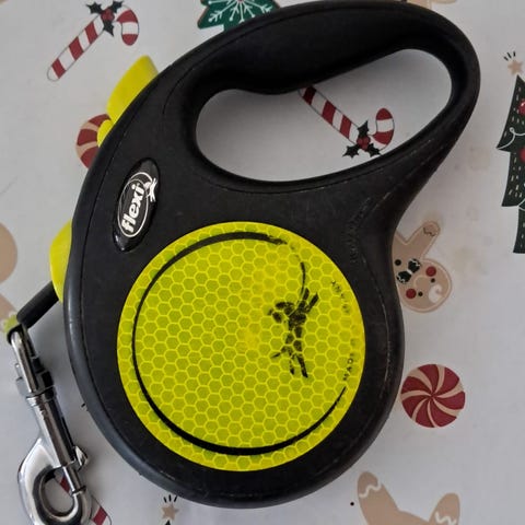 Käyttöä nähnyt, mutta käyttökelpoinen musta kelatalutin pienelle koiralle. Pyöreä nauha.