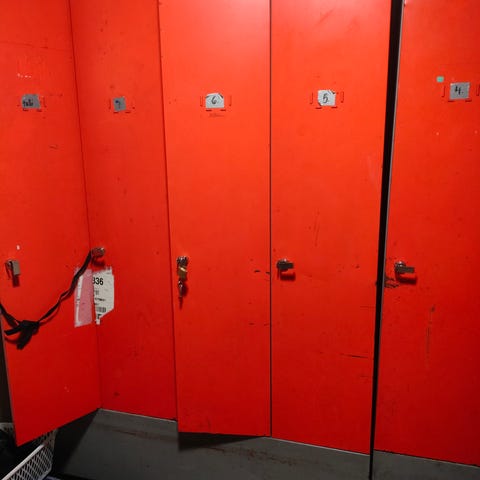Kuvasta poiketen lasioven koristeet poistettu. Umpiovisen kaapin toisen sivuseinän alareunasta on irronnut pinnasta palanen, joka on tallella ja liimattavissa paikoilleen.
