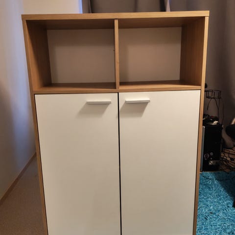 Myytävänä Iskusta 90-luvulla ostetut kaksi kaappia, joista toinen on lasiovinen ja toinen umpiovinen.