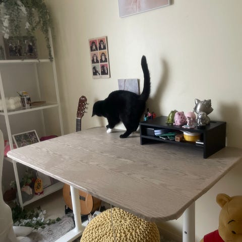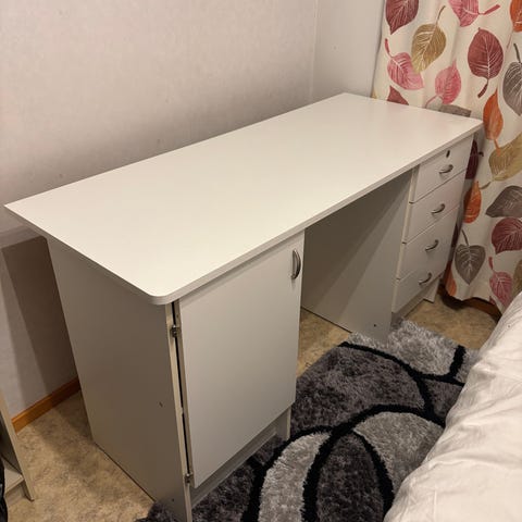 Valkoinen Micke-työpöytä, 105x50cm. Käytönjälkeä on, mutta ehjä ja siisti kuitenkin.