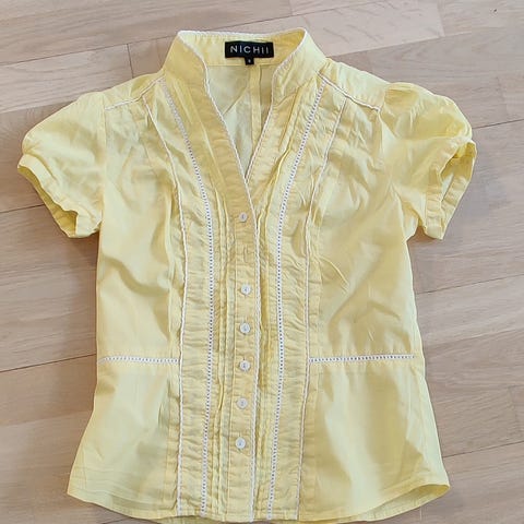 Hyväkuntoinen naisten lila silkkinen lyhythihainen kauluspaita. Pitkänmallinen. Merkki: Nikka. Koko: XS/S.